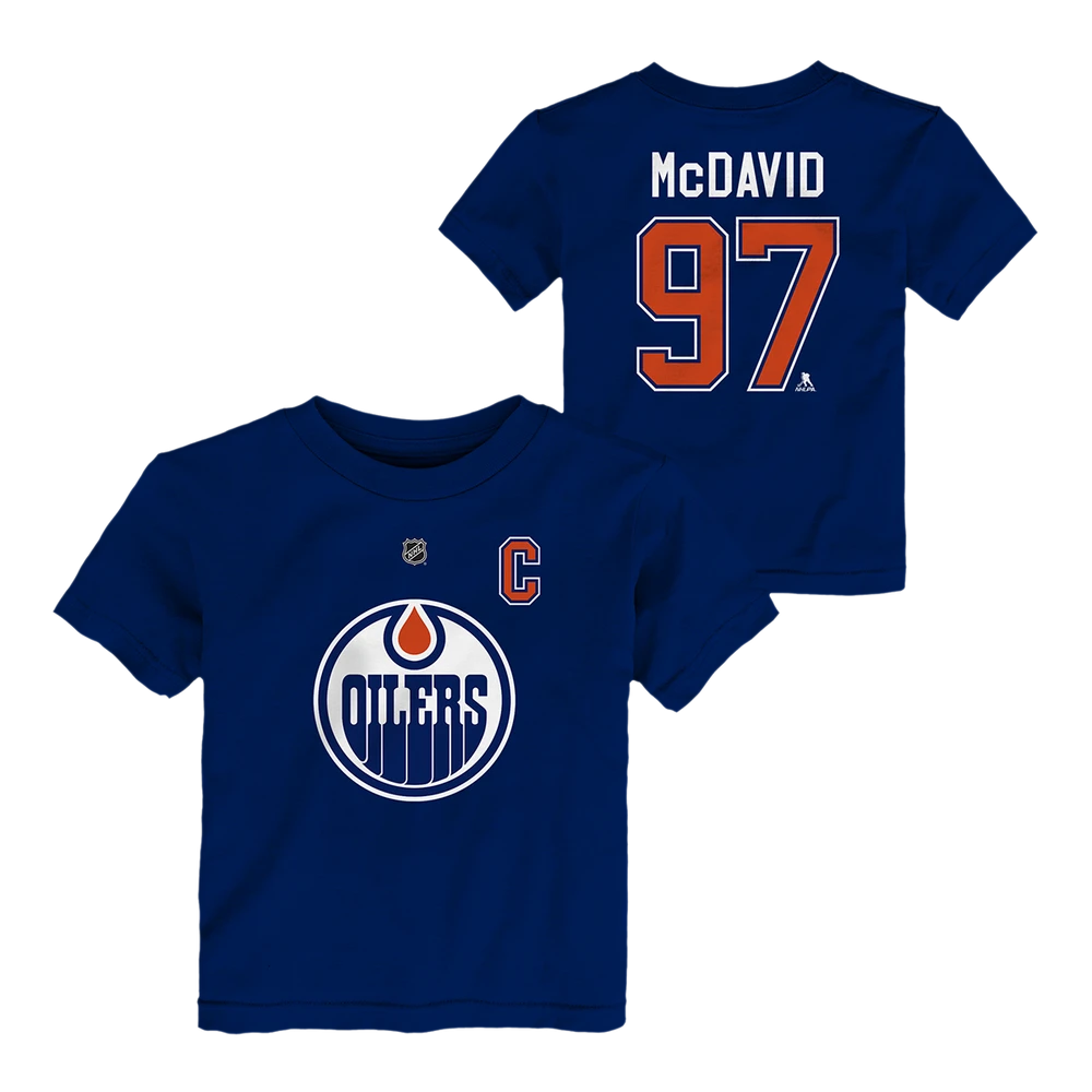 New for the 2023-2024 NHL season the Edmonton Oilers NHL Team colour/Home player name and number short sleeve tee. Iconic dark blue design with Oilers team logo screen print at center chest. Complete with Connor McDavid #97 name and number on back. This is a must have player tee for any young Oilers fan. Officially licensed by the NHL and Nhlpa. Infant 12M to 24M size range.